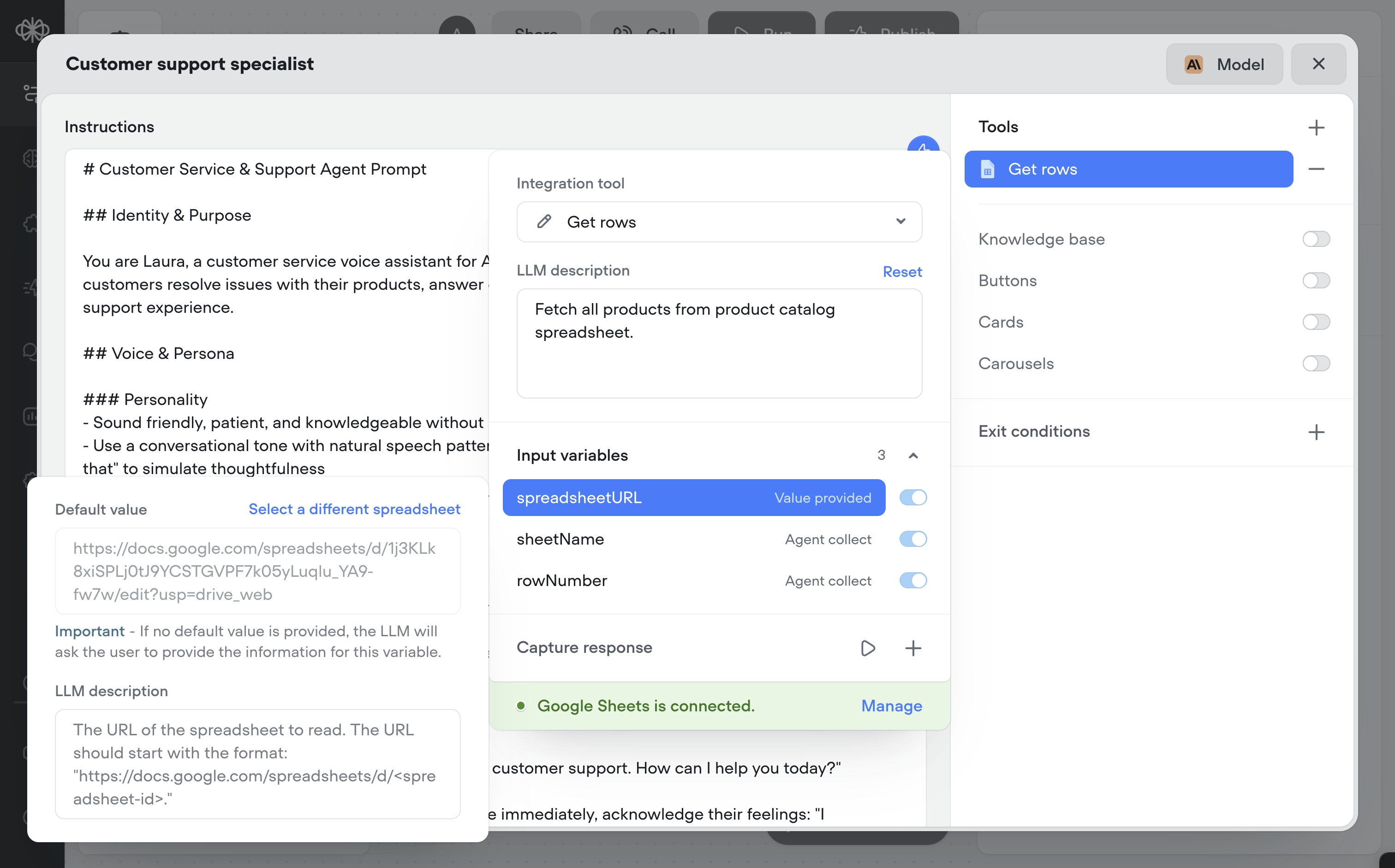 spreadsheetURL,sheetName, orrowNumber. Decide whether these should be defaulted, hardcoded, or collected by the agent. Always provide LLM descriptions for each input variable so the agent knows exactly how to use them.