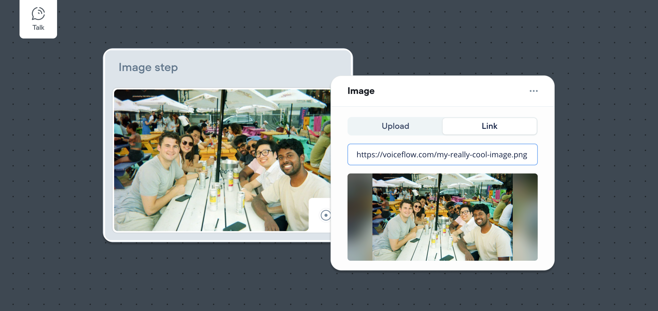 The Image step allows your agent to send an image or animated gif to the user. This can be useful when building eCommerce agents as you can send product images, or when building SaaS support agents as you can send screenshots of the steps the user should allow.