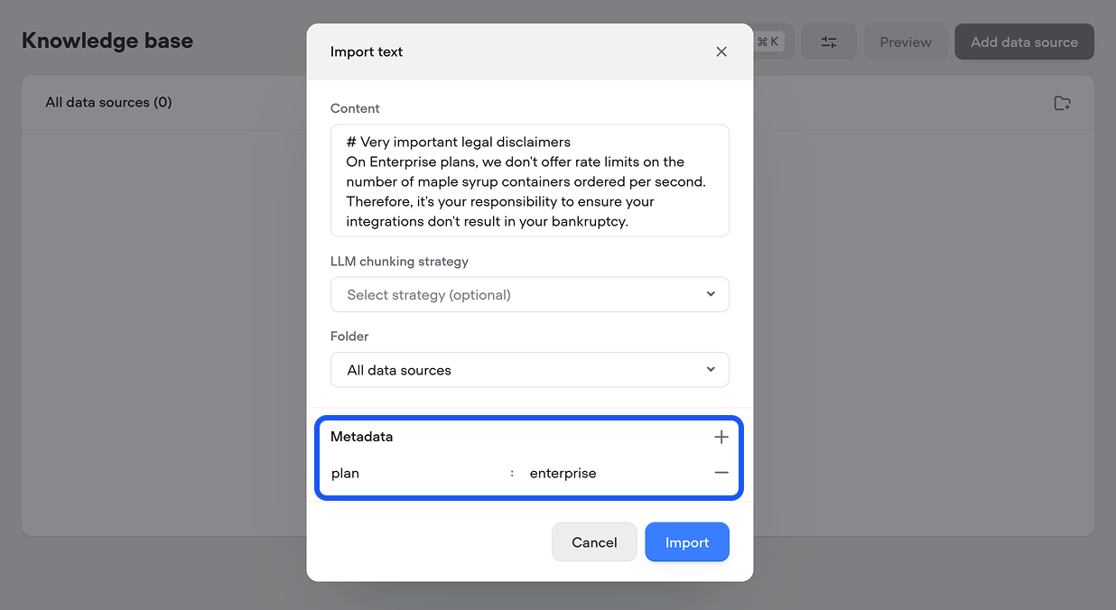 This can be useful if you have multiple brands, product lines or subscription tiers and want to ensure the correct category of information is returned. For example, if you're building an agent for a SaaS platform which has different policies versus self-serve customers, you could add metadata with the key plan and value enterprise or regular to each data source, based on which type of customer the information is relevant for.