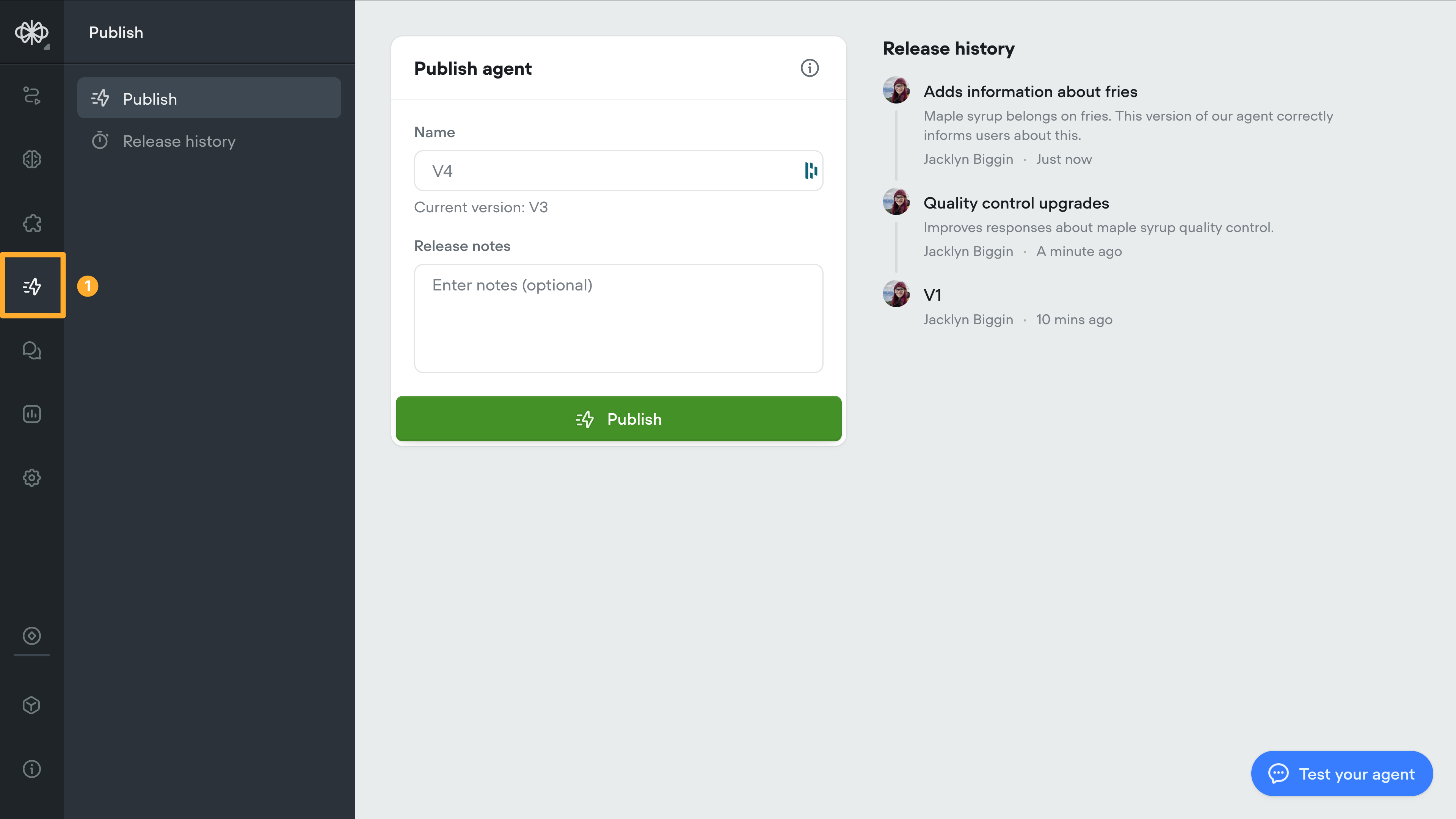 You can access your agent's release history by clicking the lighting bolt icon on the editor's sidebar. From here, you can see the names, release dates, and changelog notes about each release, as well as the person who published it.