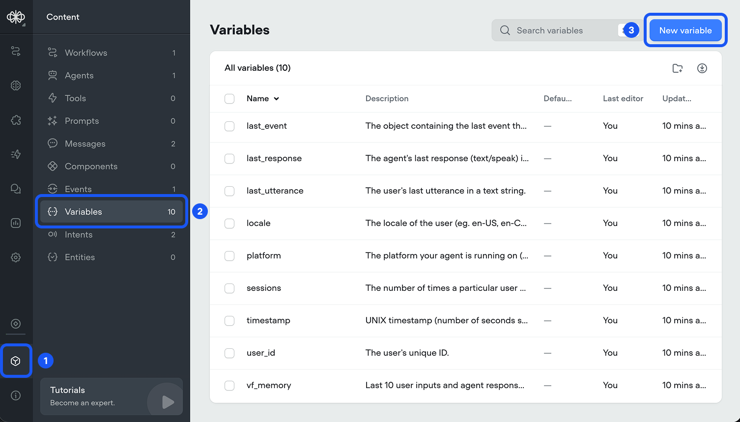 Variables let your agent remember and reuse information during a conversation. You can store details like a user’s name and account details, then reference them later to personalize responses or make decisions in your flow. Variables act as your agent’s short-term memory, helping it keep track of what matters from one step to the next.