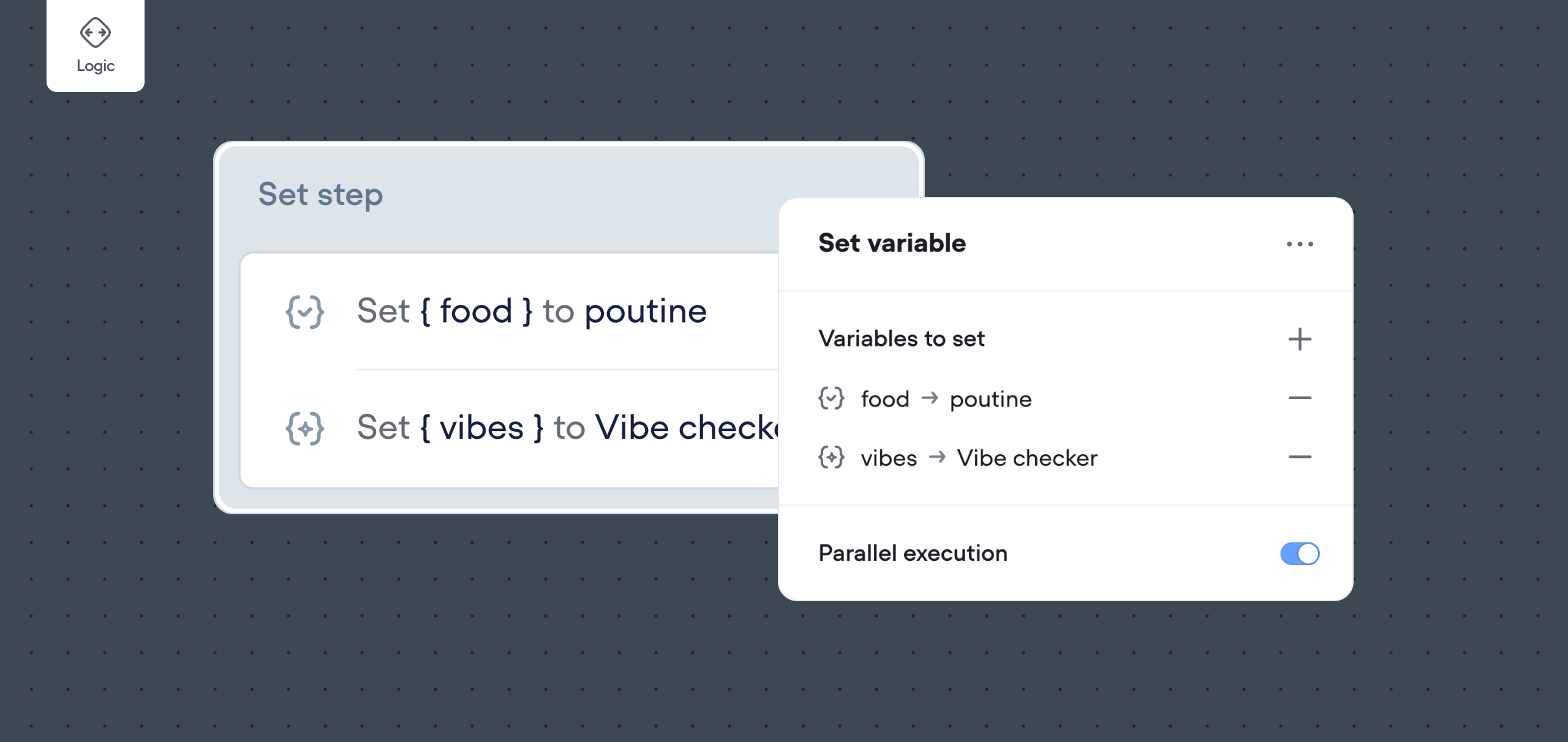 Tip: You can add multiple variable settings within a single Set Step by using the “Add Set” button in the Set Step menu. Changes are applied sequentially from top to bottom.